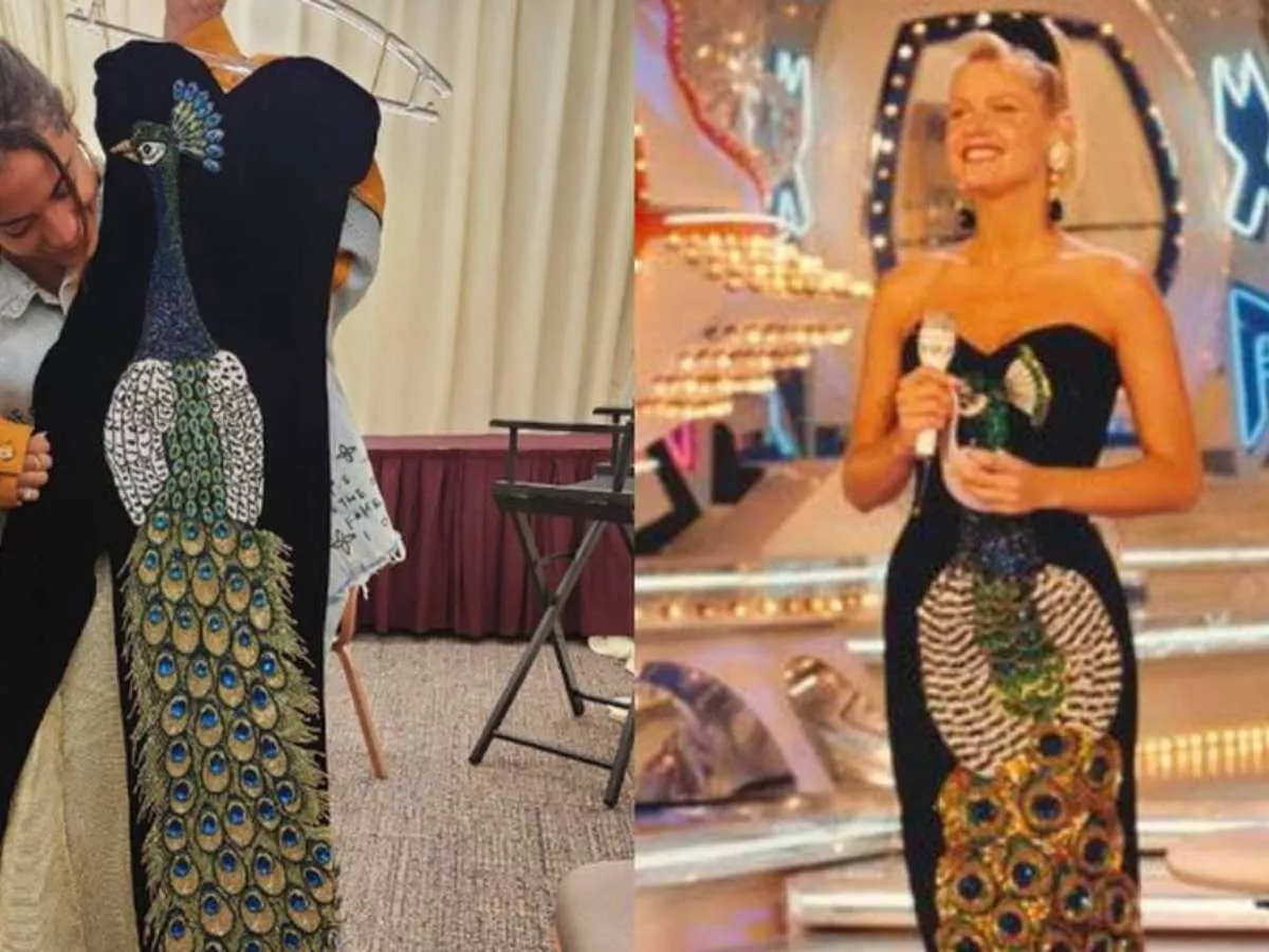 Na imagem, a apresentadora mostra uma foto de bastidor onde Anitta apareceu exibindo o vestido. A peça possui aplicações em pedrarias que montam o formato de um pavão na saia. "Duas rainhas", "Absurdo de lindo", "Duas divas", "Rainhas", "Você merece, Xu! Ela arrasou na escolha" foram alguns dos comentários que os seguidores de Xuxa Meneghel deixaram na publicação. Fonte: Marie Claire