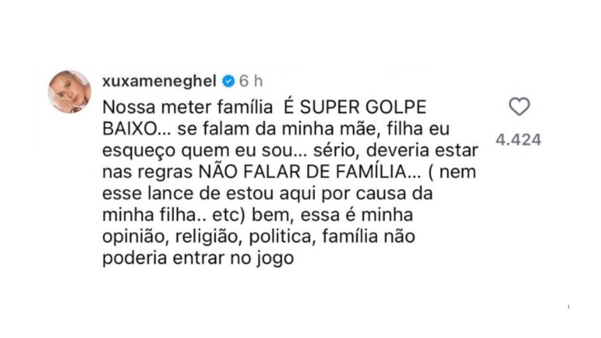 Fora do programa, a repercussão também foi imediata. No Instagram, Xuxa criticou a postura do brother: “Nossa, meter família é super golpe baixo… Se falam da minha mãe, filha, eu esqueço quem eu sou… Sério, deveria estar nas regras ‘não falar de família’… (nem esse lance de estou aqui por causa da minha filha.. etc.). Bem, essa é minha opinião, religião, politica, família não poderiam entrar no jogo”, opinou.