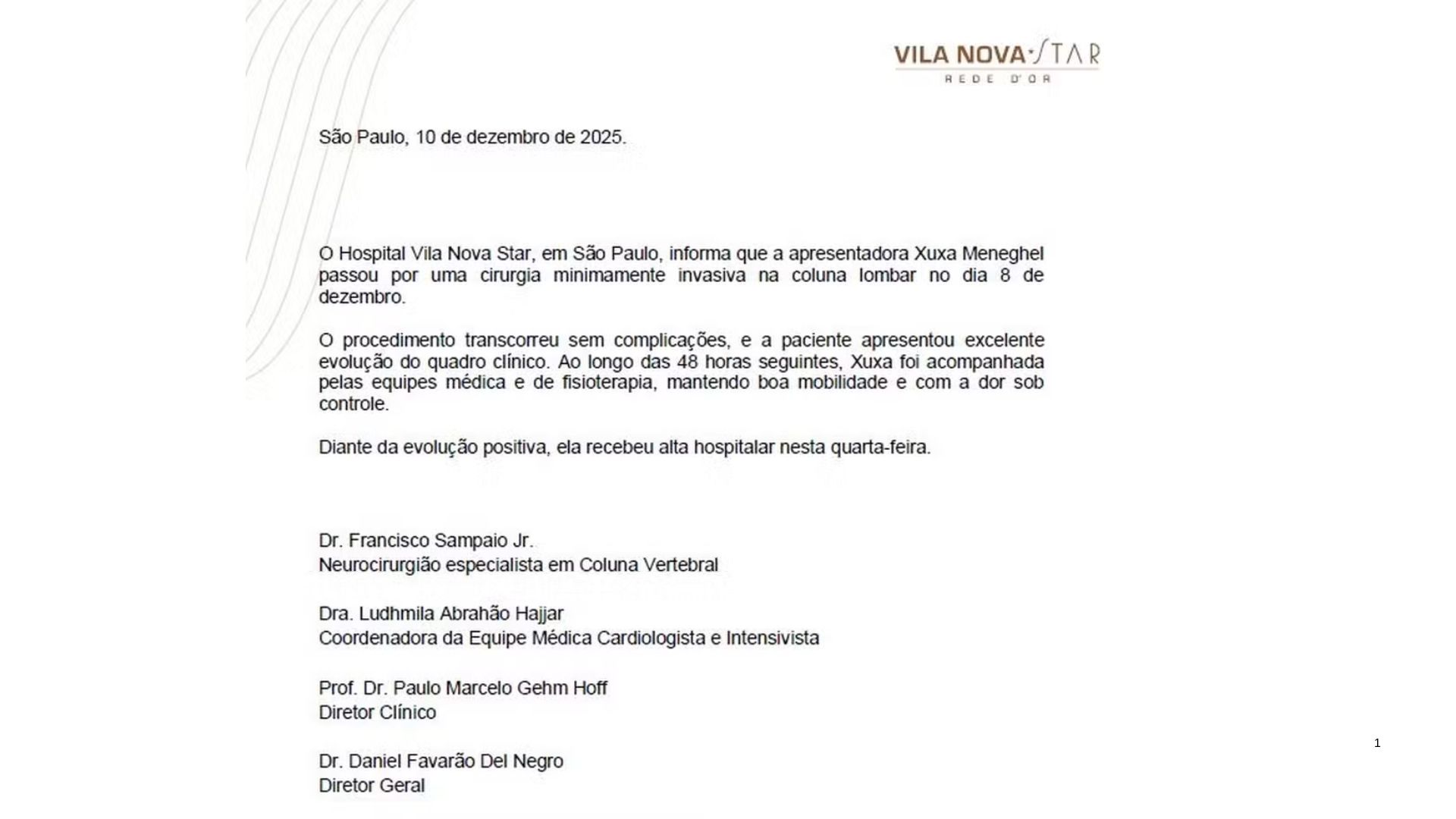 A apresentadora Xuxa, de 62 anos, recebeu alta nesta quarta-feira (10) no Hospital Vila Nova Star, em São Paulo, onde passou por uma cirurgia "minimamente invasiva" na segunda-feira (8). O procedimento foi realizado para tratar um desgaste em um disco intervertebral, que causava compressão nervosa e dor. A alta ocorreu após avaliação médica que constatou excelente evolução clínica e boa mobilidade durante o acompanhamento.