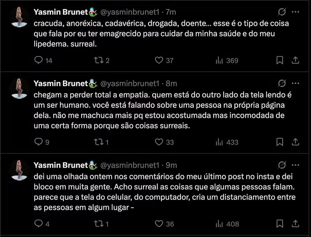 Yasmin Brunet fez um desabafo, nesta quinta-feira (10), sobre os comentários negativos que recebe sobre o seu corpo. No X (antigo Twitter), a influenciadora fez publicações sobre a falta de empatia das pessoas.