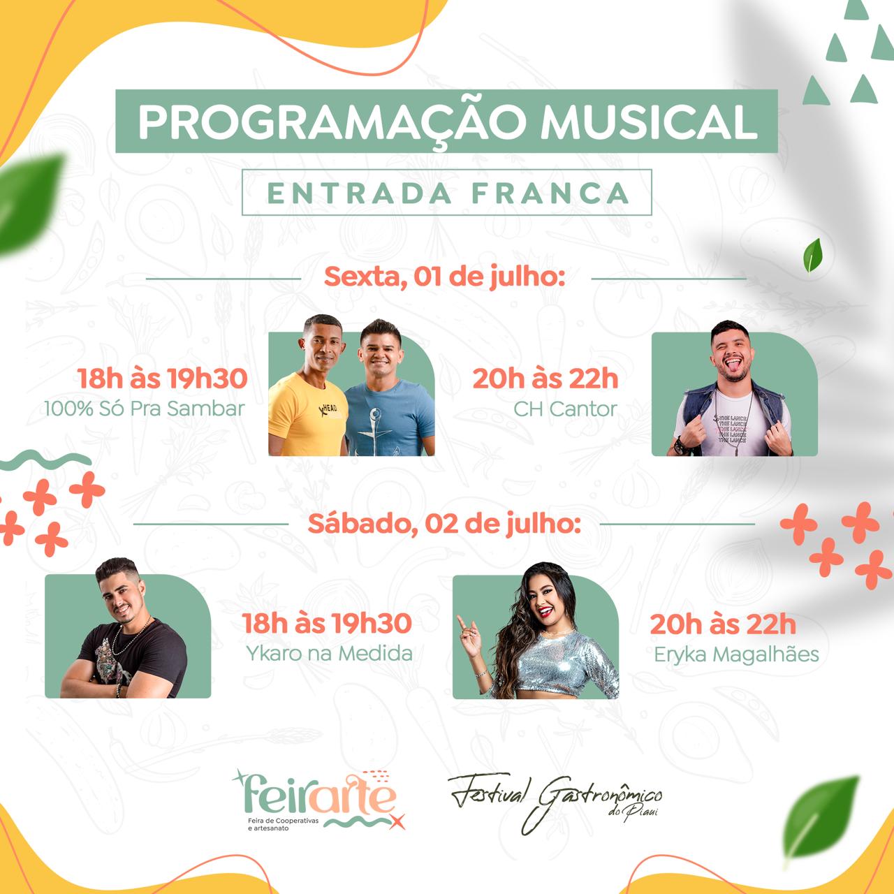 Na sexta-feira, dia 1º de julho, se apresentam o grupo de pagode 100% Só Pra Sambar e logo em seguida CH Cantor, assume o palco do evento. Já no sábado, dia 2, Ykaro na Medida e a cantora Eryka Magalhães, são atrações no encerramento da  Feirarte e Festival Fastrônomico.