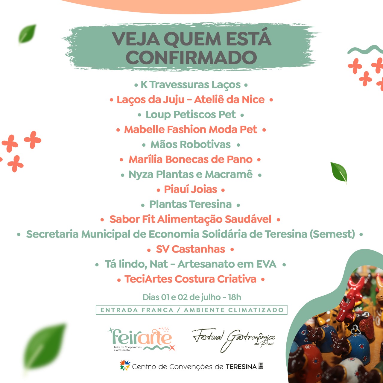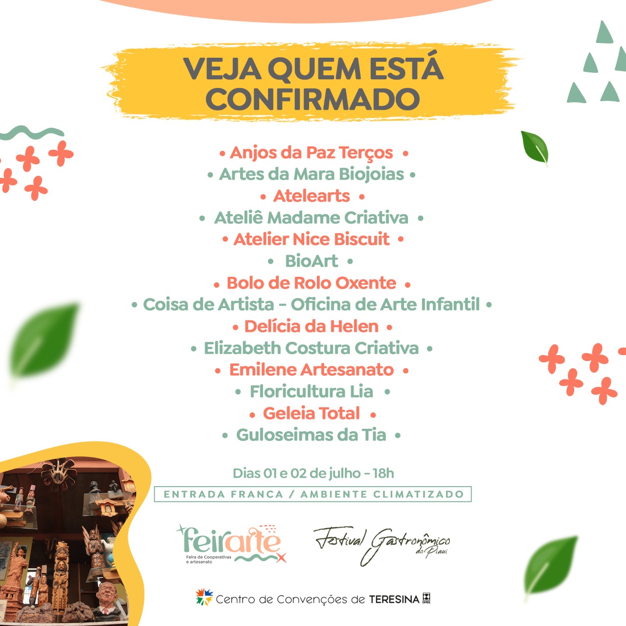 Nesta sexta (01) e sábado (02), o Centro de Convenções de Teresina recebe a Feira de Cooperativas e Artesanato – FeirArte e o Festival Gastronômico do Piauí. O evento vai contar com apresentações musicais gratuitas, comidas típicas, exposição de peças artesanais, além de uma vasta programação preparada para o público piauiense apreciar ao lado de toda família. Vale destacar que a entrada no evento é totalmente franca.