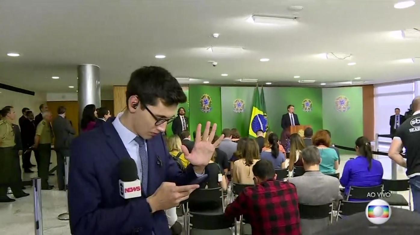 ReproduçãoRenata Vasconcellos anunciou o início do pronunciamento do presidente, mas do nada a câmera desviou para o repórter, que escrevia as falas no bloco de notas de seu celular. Imediatamente, ele notou que estava ao vivo e fez sinal para o cinegrafista, que aproximou ainda mais a imagem para ajustar o foco.