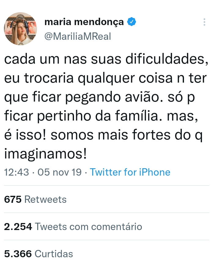 "Cada um nas suas dificuldades, eu trocaria qualquer coisa para não ter que ficar pegando avião. Só para ficar pertinho da família. Mas é isso! Somos mais fortes do que imaginamos!", disse a artista.