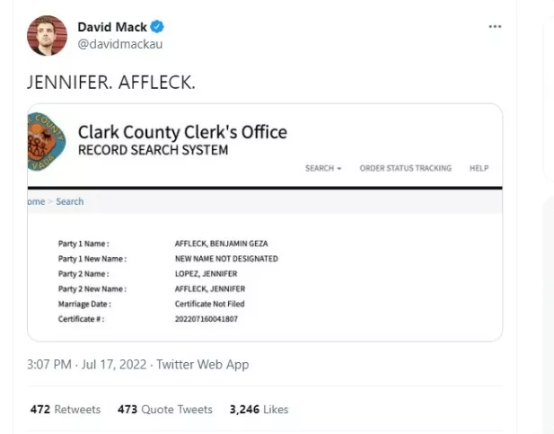Segundo o site Just Jared, a certidão da oficialização da união mostra seu novo nome: Jennifer Affleck. A foto do sistema do condado de Clark, em Nevada, foi publicada por um jornalista no Twitter.