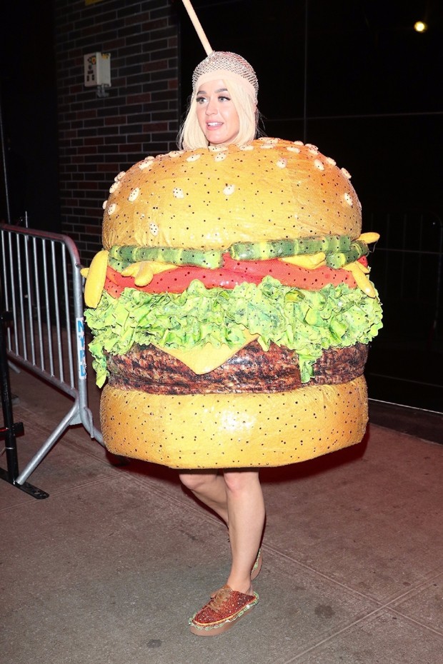 Risos[...]. Após se vestir de 'lustre' para o MET Gala, agora Katy Perry surpreendeu e se vestiu de "hambúrguer" para o after party do evento.