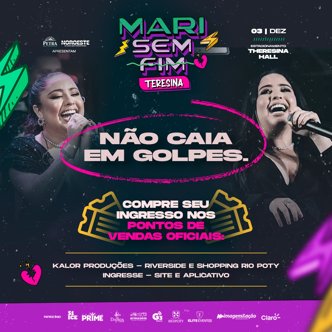 A Kalor Produções, organizadora do "Mari Sem Fim" em Teresina, orienta o público para não cair em golpes na hora de comprar os ingressos e principalmente não adquirir a entrada na mão de terceiros. A produtora não se responsabiliza por danos e prejuízos advindos desses tipos de vendas.