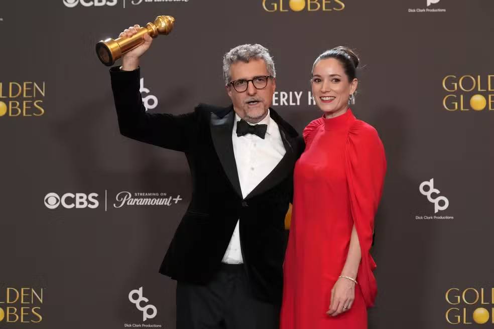 Kleber Mendonça Filho e Emilie Lesclaux mostram Globo de Ouro por melhor filme em língua não-inglesa de 'O agente secreto' — Foto: Chris Pizzello/AP
