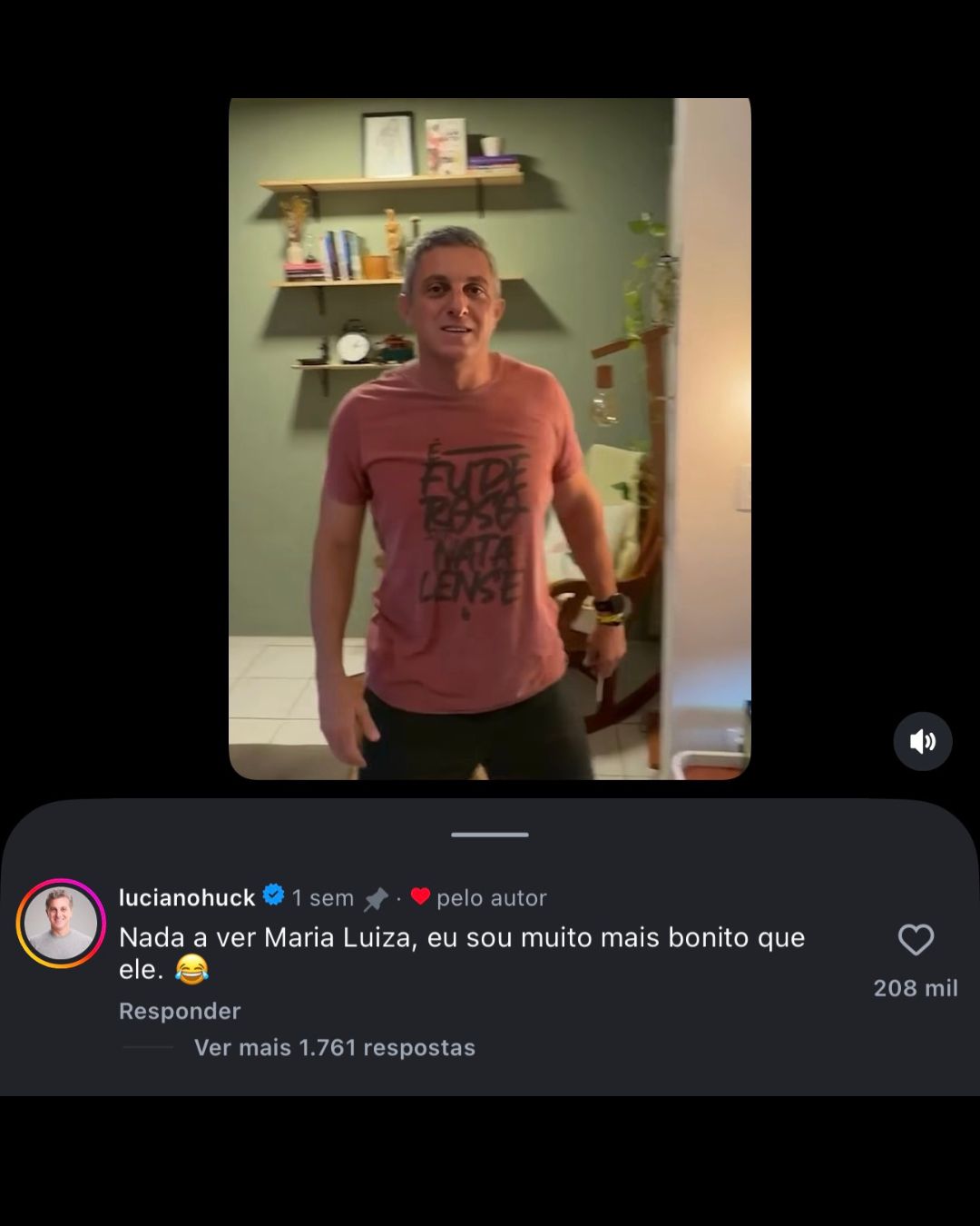 A publicação ultrapassou 400 mil curtidas e reuniu milhares de comentários, inclusive de famosos. Entre eles, o próprio Luciano Huck, que entrou na onda e escreveu exatamente a mesma frase: “Nada a ver, Maria Luiza, eu sou muito mais bonito que ele”. O comentário do apresentador também viralizou, somando mais de 200 mil curtidas.