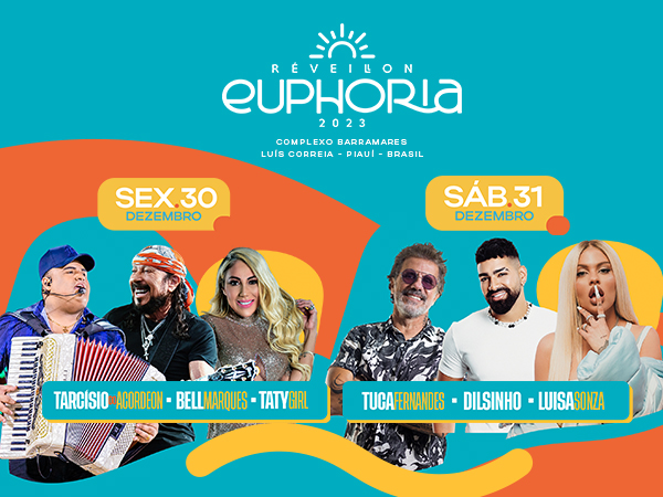 O Réveillon Euphoria chega para aquecer Luís Correia, litoral do Piauí, para 2023. A grande festa, que tem como atrações Bell Marques, Dilsinho, Luísa Sonza, Tarcísio do Acordeon, Taty Girl e Tuca Fernandes, está chegando. Nos dias 30 e 31 de dezembro, o Complexo Barramares vai ser pura animação e alegria.