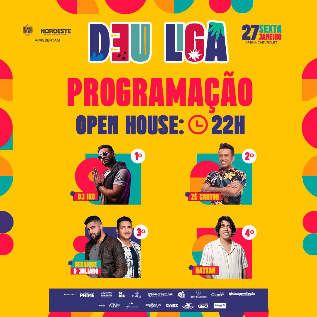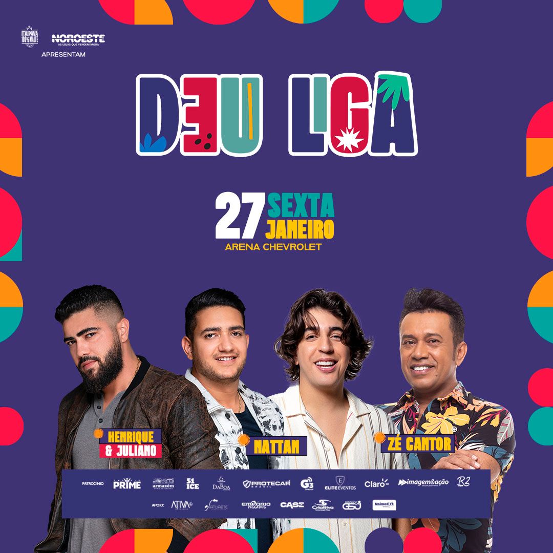 Abrindo o calendário de grandes shows em Teresina, o Deu Liga acontece hoje, dia 27 de janeiro, na Arena Chevrolet com shows de Nattan, Zé Cantor, Henrique e Juliano. O evento teve a ordem de apresentação das atrações divulgadas na quarta-feira (25).