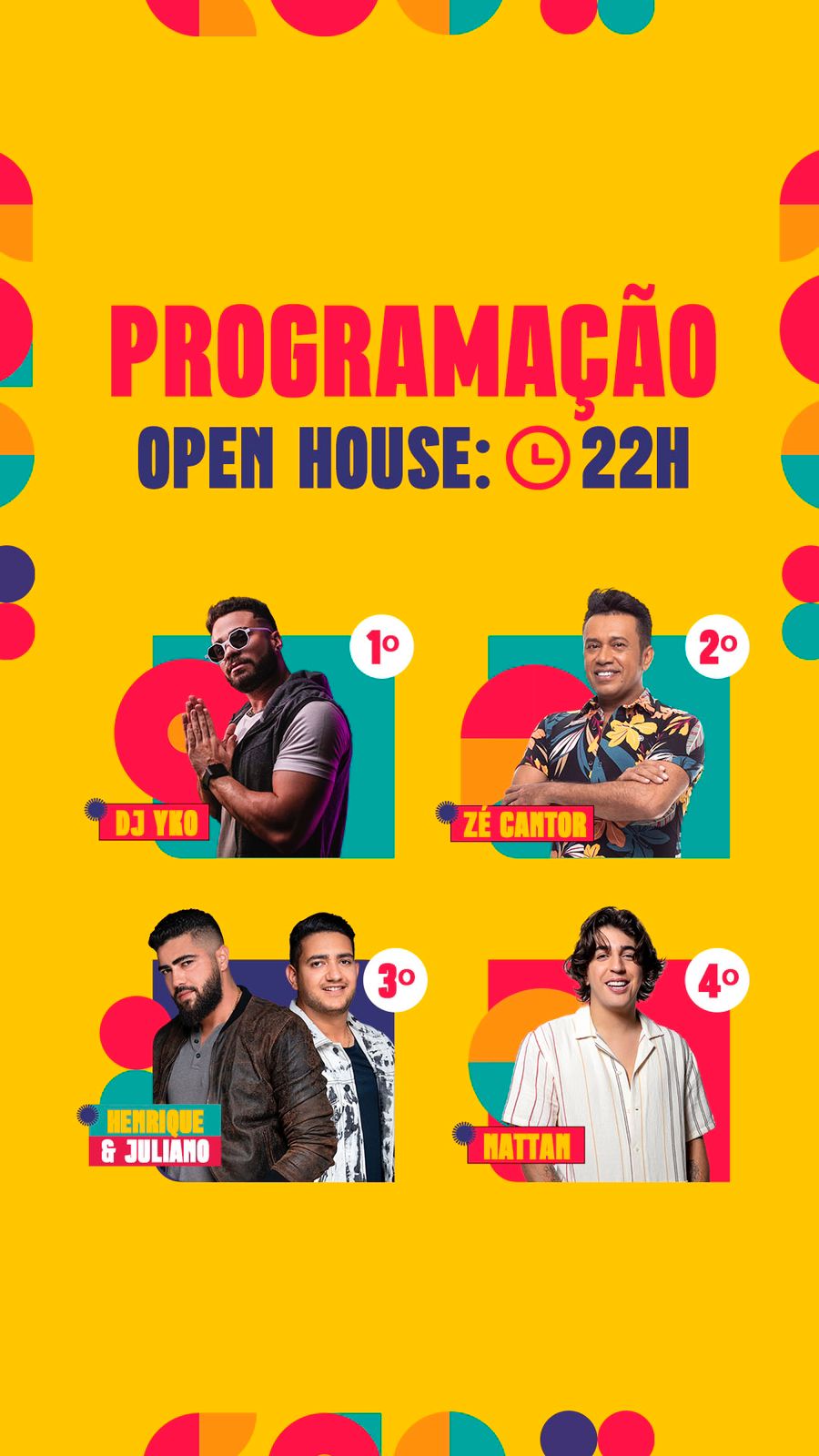 Abrindo os trabalhos, o Dj Yko promete iniciar a noite com sucessos de variados estilos. Em seguida, é a vez da voz potente de Zé Cantor. Logo após, é a vez dos donos da festa, Henrique e Juliano. Por fim, o público presente deve ver o sol nascer ao som de Nattanzinho.
