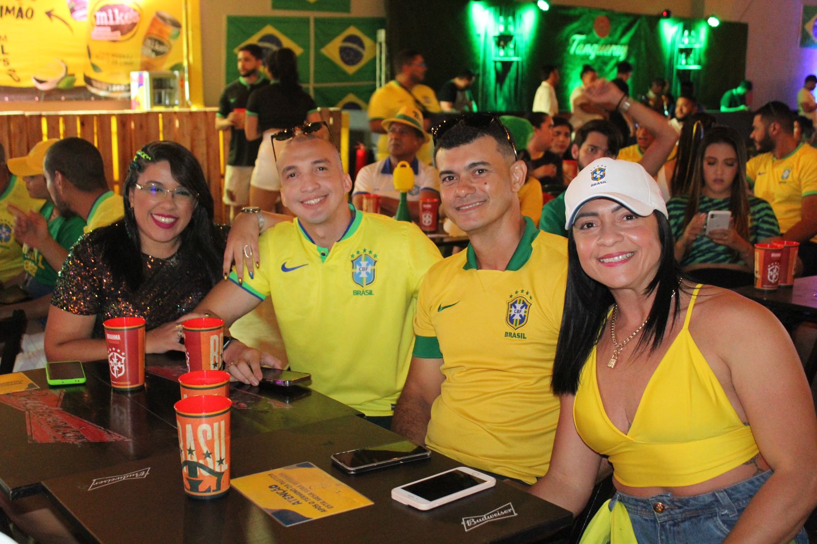 Acompanhada de familiares e amigos, a recepcionista Kátia Araújo apostou na animação para dar mais garra à Seleção Brasileira. “Vamos vencer por dois a zero, estamos confiantes”, avisou.
