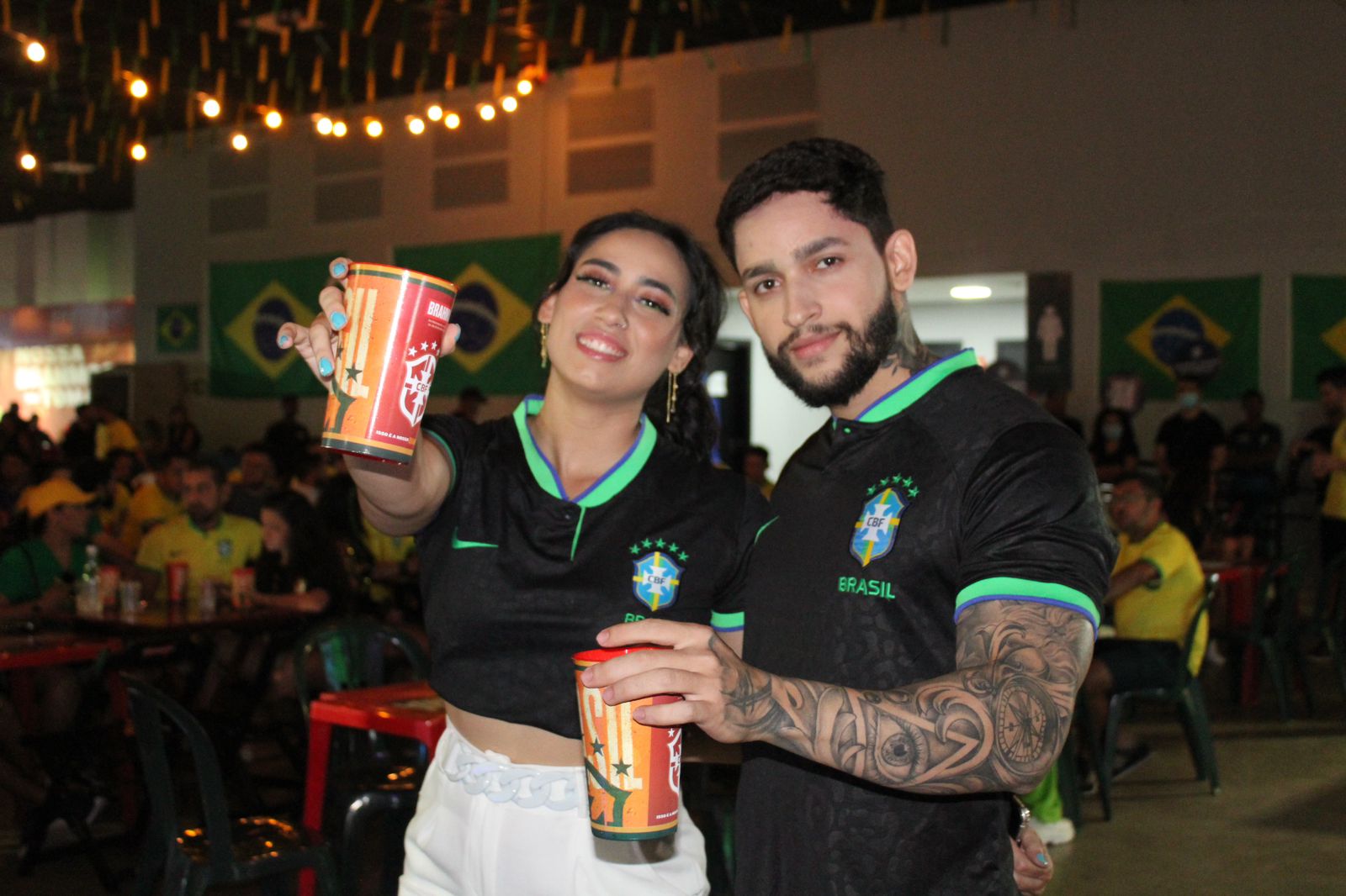 Ela usou um vestido inspirado na camisa oficial da Seleção Brasileira e maquiagem colorida para assistir o terceiro jogo do Brasil na Copa do Catar. “Sempre reforço minha produção para torcer pela nossa seleção e aproveito para divulgar meu trabalho”, contou.