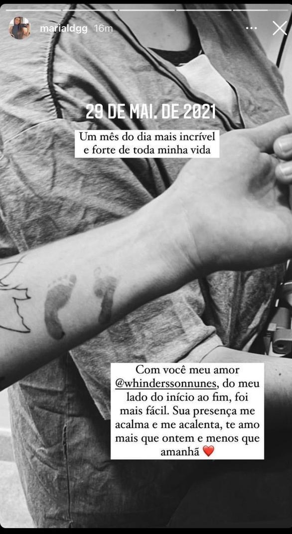 "Um mês do dia mais incrível e forte de toda a minha vida. Com você, meu amor, Whindersson, do meu lado do início ao fim, foi mais fácil. Sua presença me acalma e me acalenta. Te amo mais que ontem e menos que amanhã", escreveu ela.