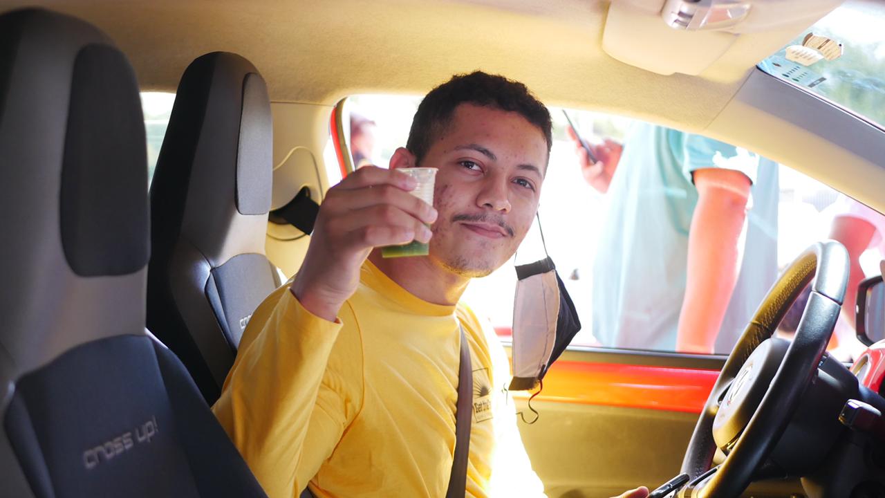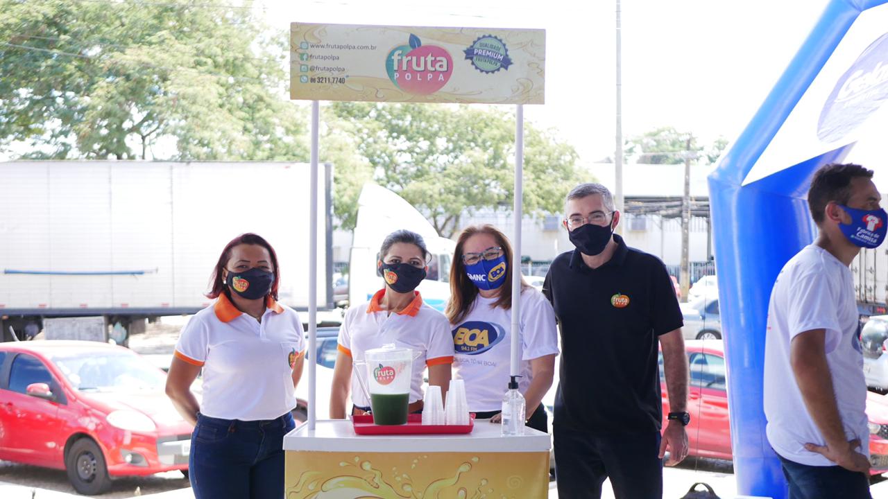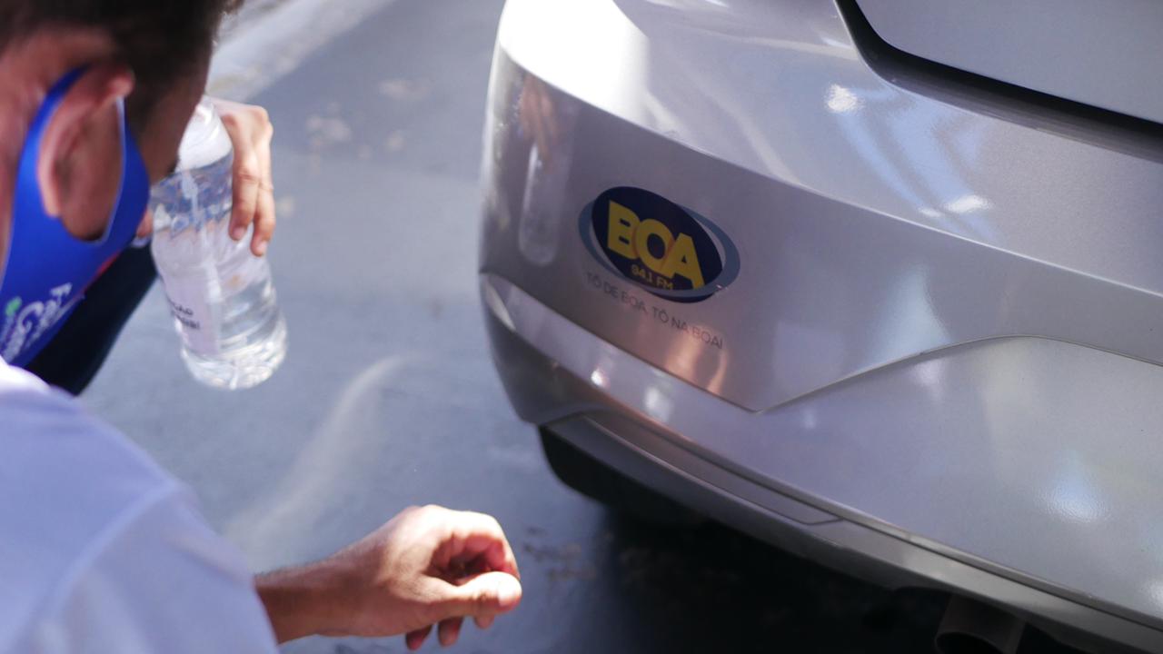 Quem se dispôs a entrar na ação na Alemanha Veículos recebeu suco da Polpa Fruta, sorvete Gellat's de diversos sabores, adesivos da Rádio BOA FM e água mineral da Ouro da Mina
