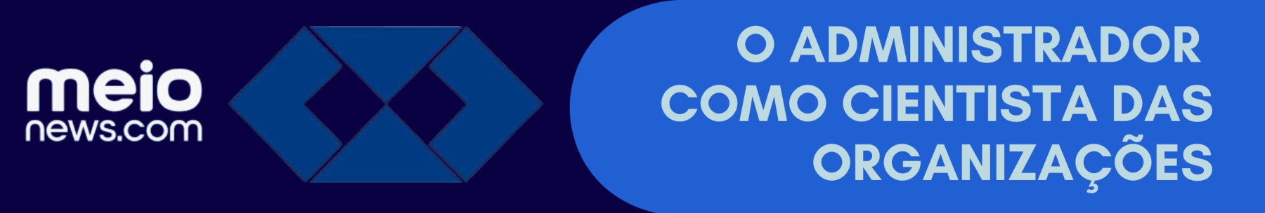 #PARATODOSVEREM A imagem tem fundo azul-escuro e está dividida em duas partes. À esquerda, aparece o logotipo do site meionews.com: a palavra “meio” em letras brancas grandes e arredondadas, e abaixo, em menor tamanho, o texto “news.com”, também em branco. Ao lado, há um símbolo geométrico formado por quatro losangos azul-escuro unidos pelas pontas, criando uma figura simétrica que lembra duas setas opostas. À direita, sobre um círculo azul-claro, está o título em letras maiúsculas brancas: “O ADMINISTRADOR COMO CIENTISTA DAS ORGANIZAÇÕES”. FIM DA DESCRIÇÃO.