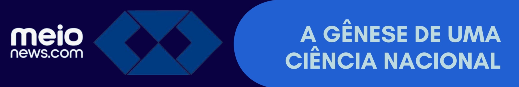 #PARATODOSVEREM A imagem tem fundo azul-escuro e está dividida em duas partes. À esquerda, aparece o logotipo do site meionews.com. A palavra “meio” está em letras grandes, brancas e arredondadas, e abaixo dela, em menor tamanho, está escrito “news.com” também em branco. Ao lado do texto, há um símbolo geométrico formado por quatro losangos azul-escuro, unidos pelas pontas, lembrando uma seta dupla ou um mosaico simétrico.À direita, sobre um círculo azul-claro, em letras maiúsculas brancas, lê-se o título: “A GÊNESE DE UMA CIÊNCIA NACIONAL”. FIM DA DESCRIÇÃO.