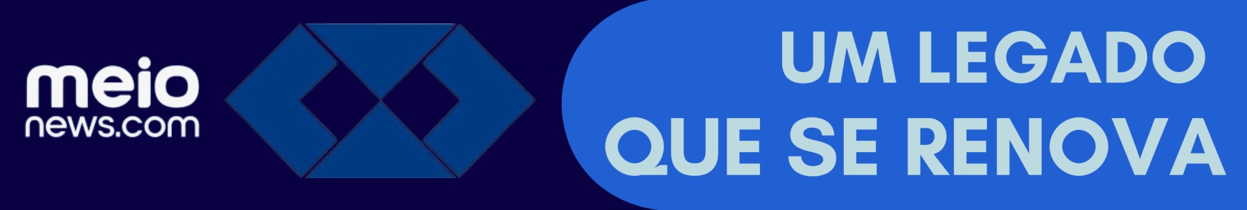 #PARATODOSVEREM A imagem tem fundo azul-escuro e está dividida em três partes. À esquerda, está o logotipo meionews.com, escrito em branco, com a palavra “meio” em negrito e “news.com” em letras mais finas. No centro, aparece um símbolo geométrico azul formado por quatro losangos conectados, que criam uma figura simétrica, semelhante a duas setas apontando uma para a outra. À direita, em um círculo azul-claro, destaca-se a frase em letras maiúsculas: “UM LEGADO QUE SE RENOVA”. FIM DA DESCRIÇÃO.