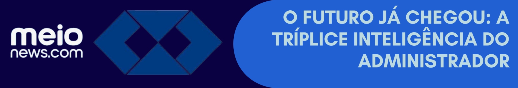 #PARATODOSVEREM A imagem apresenta fundo azul-escuro e está dividida em três partes principais. À esquerda, aparece o logotipo do portal meionews.com, escrito em letras brancas, com “meio” em negrito e “news.com” em tipografia mais fina. No centro, há um símbolo geométrico em azul, formado por losangos que se conectam de maneira simétrica, lembrando uma seta dupla apontando para dentro. À direita, em um círculo azul-claro, está a chamada em letras maiúsculas brancas: “O FUTURO JÁ CHEGOU: A TRÍPLICE INTELIGÊNCIA DO ADMINISTRADOR”. FIM DA DESCRIÇÃO.
