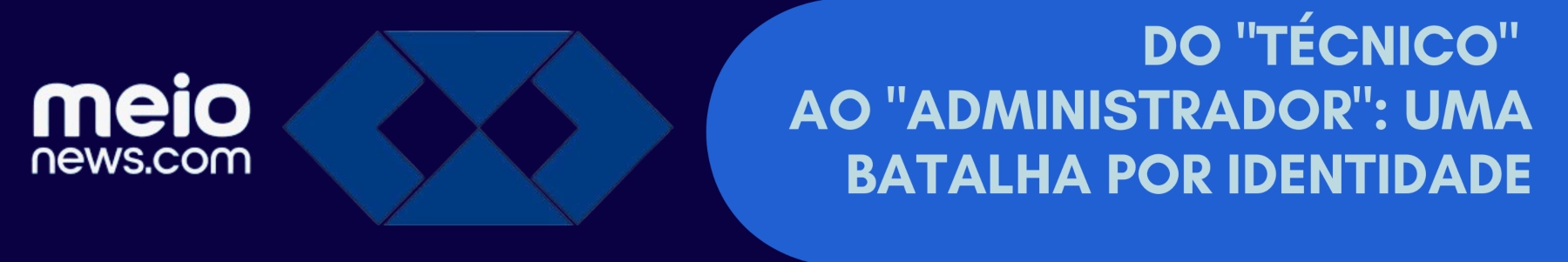 #PARATODOSVEREM A imagem tem fundo azul-escuro e segue o mesmo padrão visual da anterior, dividida em duas partes. À esquerda, está o logotipo do site meionews.com. A palavra “meio” aparece em letras brancas grandes e arredondadas, enquanto abaixo, em menor tamanho, lê-se “news.com”, também em branco. Ao lado do texto, há um símbolo geométrico formado por quatro losangos azul-escuro unidos pelas pontas, criando uma figura simétrica que lembra duas setas opostas - a figura representa a administração. À direita, sobre um círculo azul-claro, está o título em letras maiúsculas brancas: “DO ‘TÉCNICO’ AO ‘ADMINISTRADOR’: UMA BATALHA POR IDENTIDADE”. FIM DA DESCRIÇÃO.