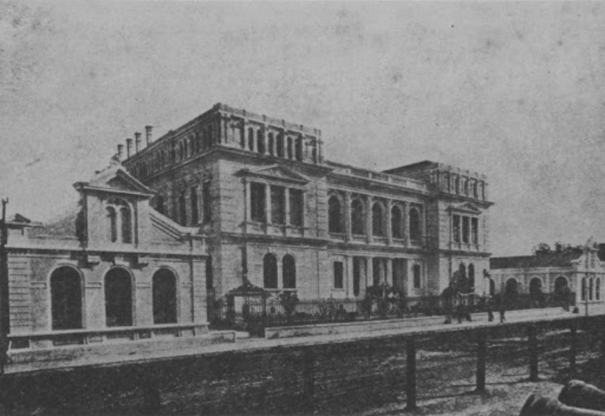 #PARATODOSVEREM imagem em preto e branco mostra um prédio imponente de estilo neoclássico, com dois andares principais e um nível superior mais recuado, ornamentado por janelas altas e arcos bem definidos. A fachada é marcada por linhas retas, colunas e grandes vãos envidraçados, transmitindo solidez e imponência. À esquerda, uma edificação menor, integrada ao conjunto, exibe três arcos na parte inferior e duas janelas no andar superior. À direita, vê-se uma extensão mais baixa, também conectada ao edifício central. Em frente ao prédio, há uma calçada larga onde circulam algumas pessoas e carroças puxadas por cavalos, sugerindo um registro fotográfico do início do século XX. O conjunto arquitetônico retratado é o histórico prédio da Universidade de São Paulo (USP), em sua configuração original. FIM DA DESCRIÇÃO.