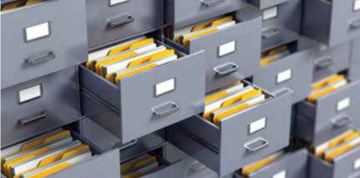 #PARATODOSVEREM A imagem mostra um conjunto de arquivos metálicos de escritório, dispostos lado a lado em várias colunas. As gavetas estão parcialmente abertas, revelando pastas suspensas organizadas em seu interior. As pastas são de cor amarela com abas brancas, onde normalmente se colocam etiquetas de identificação. O mobiliário é de tom cinza e transmite a ideia de organização e armazenamento sistemático de documentos, típico de ambientes administrativos, jurídicos ou de bibliotecas e arquivos históricos. FIM DA DESCRIÇÃO.
