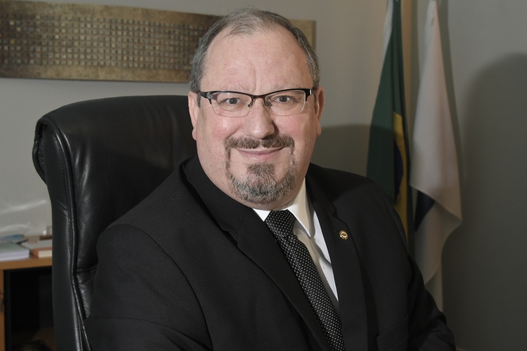 #PARATODOSVEREM A fotografia mostra Kreuz, um homem de meia-idade, sentado em uma cadeira de couro preta, posando de forma formal. Ele veste um terno escuro com gravata preta de bolinhas brancas e camisa branca. Usa óculos de armação fina e tem barba e bigode aparados. O homem sorri levemente para a câmera, transmitindo simpatia e sobriedade. Ao fundo, vê-se parte de uma parede clara, duas bandeiras posicionadas atrás — uma delas com as cores do Brasil — e um painel decorativo metálico fixado na parede. O ambiente sugere um gabinete ou escritório institucional. FIM DA DESCRIÇÃO.