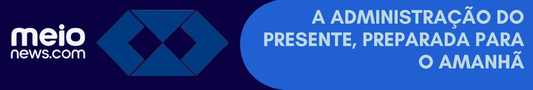 #PARATODOSVEREM A imagem tem fundo azul-escuro e é organizada em três partes. À esquerda, está o logotipo meionews.com, em letras brancas, com “meio” em negrito e “news.com” em estilo mais fino. No centro, aparece um símbolo geométrico em azul, formado por losangos conectados que criam uma figura simétrica, lembrando setas voltadas para dentro. À direita, em um círculo azul-claro, está a frase em letras maiúsculas brancas: “A ADMINISTRAÇÃO DO PRESENTE, PREPARADA PARA O AMANHÔ. FIM DA DESCRIÇÃO.