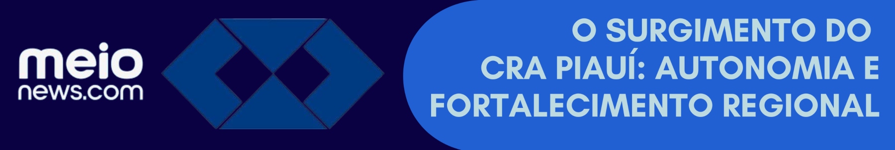 #PARATODOSVEREM A imagem tem fundo azul-escuro e é composta por três elementos principais. À esquerda, aparece o logotipo do portal meionews.com, escrito em letras brancas, com “meio” em negrito e “news.com” em tipografia mais fina. No centro, há um símbolo geométrico em azul, formado por dois losangos maiores nas extremidades e dois menores no meio, compondo um desenho simétrico. À direita, em um círculo azul-claro, está o título em letras maiúsculas brancas: “O SURGIMENTO DO CRA PIAUÍ: AUTONOMIA E FORTALECIMENTO REGIONAL”. FIM DA DESCRIÇÃO.