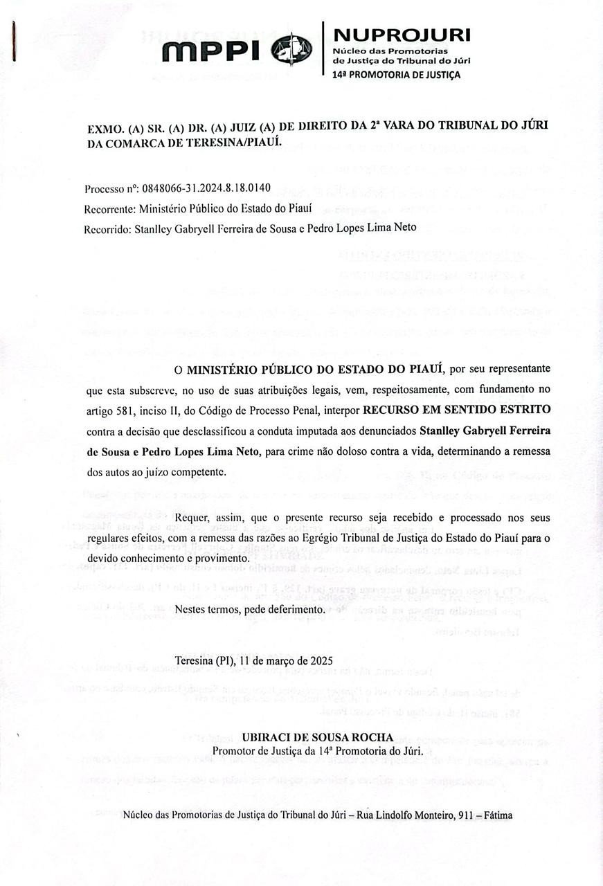 No entanto, o caso teve outra reviravolta no dia 19 de agosto de 2025, com um recurso apresentado pelo promotor Ubiraci Rocha, da 14ª promotoria do Júri do Ministério Público do Piauí, que foi aceito pelo desembargador José Vidal, do Tribunal de Justiça do Piauí. O recurso, definiu como erro a desclassificação dos crimes dos réus, retirando de homicídio doloso para culposo. O promotor defendeu ainda a tese de que o Tribunal do Júri seria o órgão constitucional para julgar crimes contra a vida.