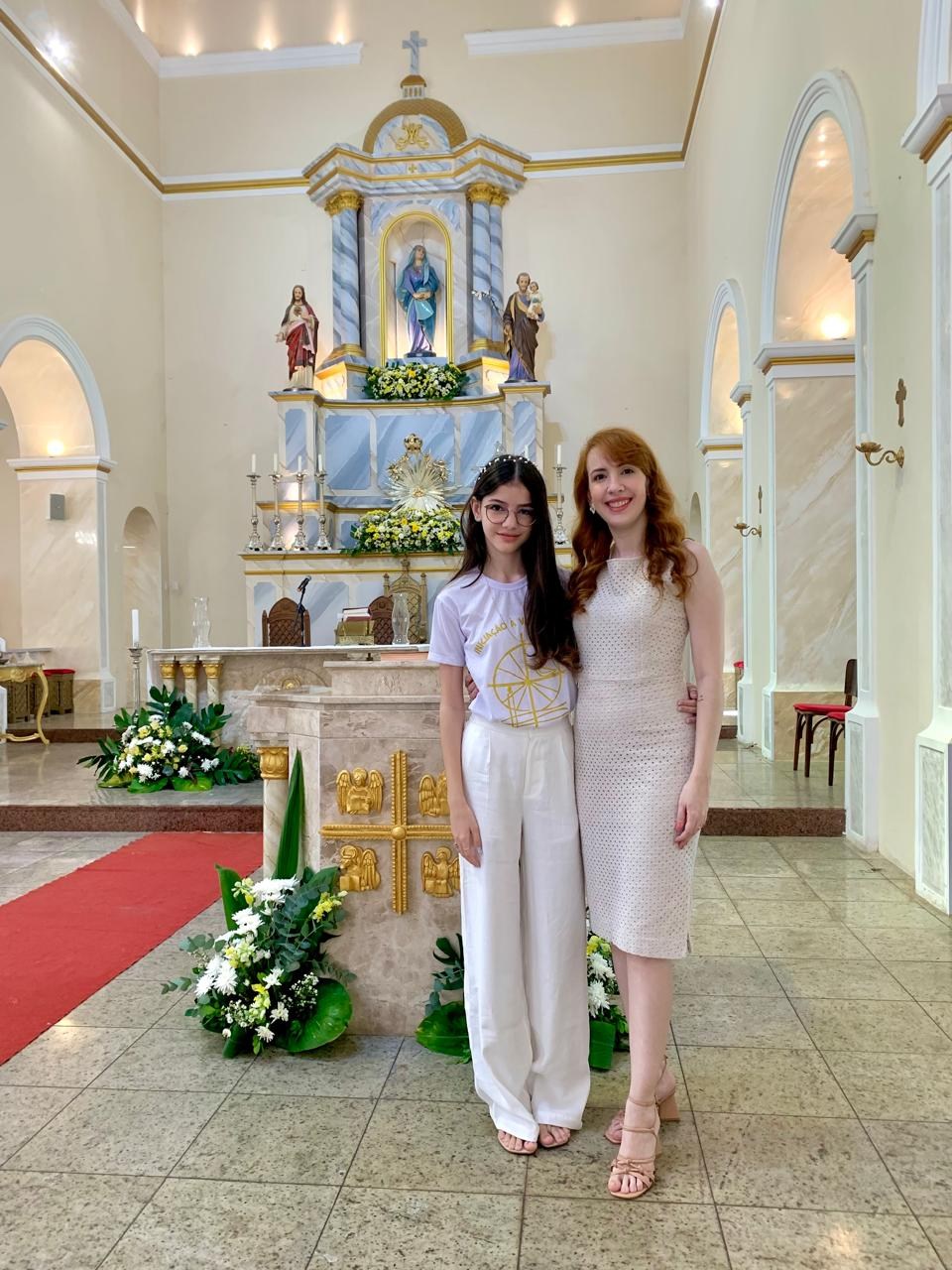 #PARATODOSVEREM: NA IMAGEM APARECE DIANA REZENDE (UMA MULHER BRANCA, DE CABELOS RUIVOS E USANDO UM VESTIDO BEGE) ABRAÇADA DE ISABELLE REZENDE (UMA MENINA BRANCA, DOS CABELOS PRETOS E QUE USA UM ÓCULOS RETANGULAR); ELAS PARECEM ABRAÇADAS, SORRINDO. AO FUNDO, IMAGENS DE ESCULTURAS DE SANTOS EM UMA IGREJA.