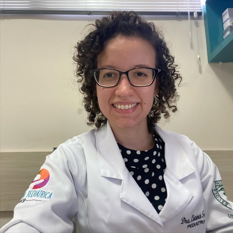 #PARATODOSVEREM: NA IMAGEM, UMA MÉDICA COM JALECO BRANCO ESCRITO 'DRA LIANA SOIDO - PEDIATRA', DE CABELOS CURTOS CACHEADOS, USA UM ÓCULOS RETANGULAR E SORRI PARA FOTO.