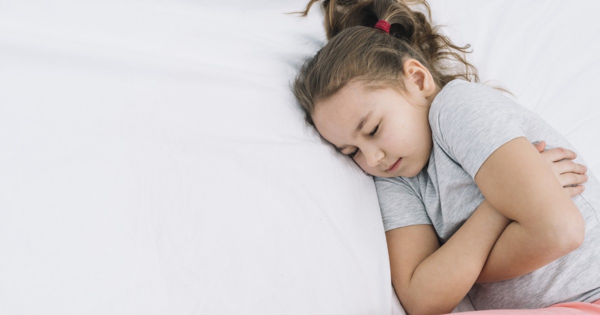 #PARATODOSVEREM: NA IMAGEM UMA CRIANÇA DE PELE BRANCA E CABELOS CASTANHOS CLAROS VESTE UMA CAMISETA CINZA E ESTÁ DEITADA COM UMA EXPRESSÃO DE DOR, COM OS BRANÇOS RECOLHIDOS PRÓXIMOS AO ABDÔMEN.