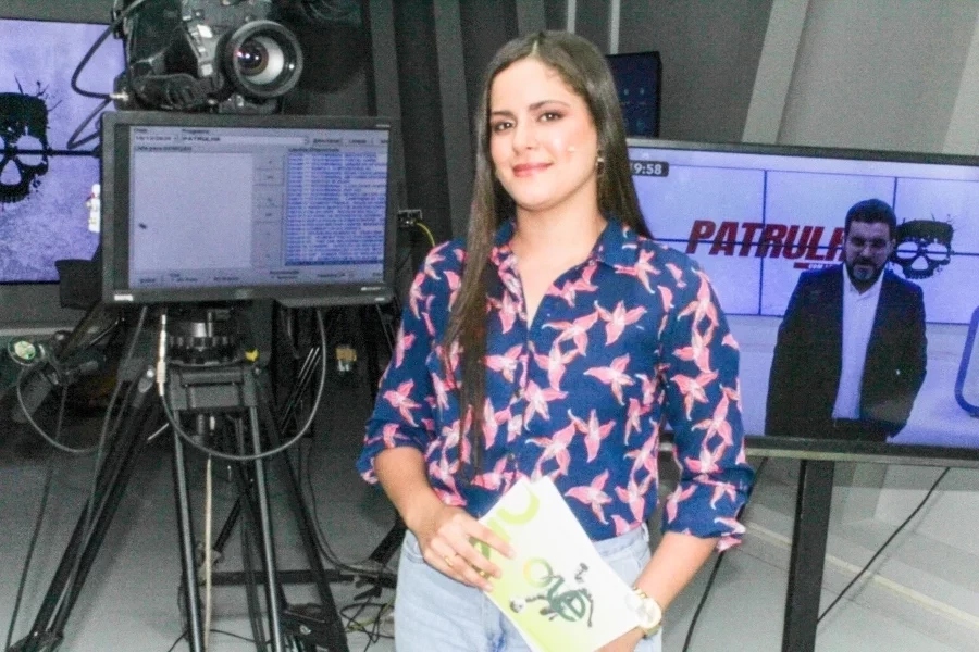 #PARATODOSVEREM A imagem mostra uma mulher em um estúdio de televisão, em pé, sorrindo levemente para a câmera. Ela tem cabelos longos, lisos e castanhos escuros, pele clara e usa maquiagem suave. Está vestida com uma camisa azul-marinho estampada com pássaros cor-de-rosa e uma calça jeans clara, transmitindo um visual casual e profissional ao mesmo tempo. Na mão direita, ela segura uma pasta ou caderno branco com detalhes em verde, provavelmente material de apoio ou roteiro de gravação. Ao fundo, o ambiente é composto por equipamentos de filmagem, incluindo câmeras de estúdio, monitores e cabos. Um dos monitores exibe a imagem de um homem de terno escuro, com o título “PATRULHA” em letras vermelhas e pretas. FIM DA DESCRIÇÃO.