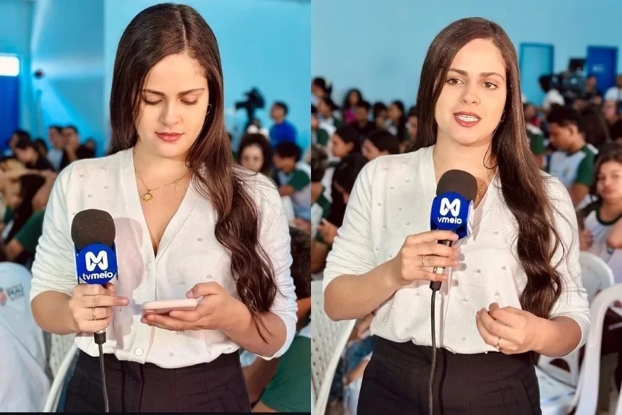 #PARATODOSVEREM A imagem é composta por duas fotografias lado a lado, mostrando uma repórter em um ambiente interno, aparentemente uma escola ou auditório, com várias pessoas ao fundo, a maioria vestindo uniformes escolares nas cores verde e branco. Na primeira foto, a repórter está olhando para baixo, segurando um celular em uma das mãos e um microfone com o logotipo azul da emissora TV Meio na outra. Ela tem pele clara, cabelos longos e castanhos, soltos e levemente ondulados. Veste uma blusa branca de manga longa com pequenos detalhes discretos e uma calça preta de cintura alta. Sua expressão é concentrada, como se estivesse se preparando para entrar ao vivo ou revisar anotações. Na segunda foto, a mesma repórter está falando, olhando à frente, com o microfone próximo à boca. Ela mantém a postura ereta e segura o microfone com as duas mãos. Ao fundo, as mesmas pessoas permanecem sentadas, prestando atenção ao que acontece no local. A iluminação é clara, destacando a repórter em primeiro plano. FIM DA DESCRIÇÃO.