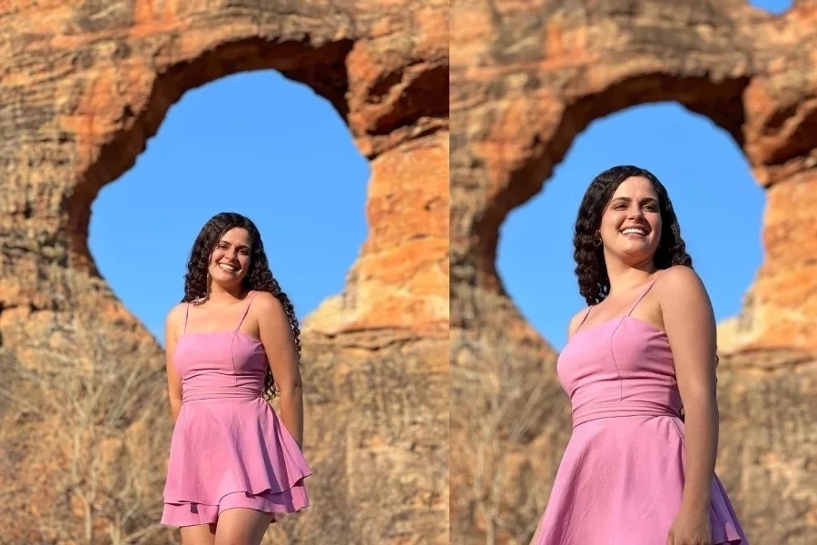 #PARATODOSVEREM A imagem é composta por duas fotografias lado a lado, mostrando uma mulher em um cenário natural de grande beleza. Ao fundo, destaca-se a Pedra Furada, um famoso ponto turístico localizado no Parque Nacional da Serra da Capivara, no Piauí. A formação rochosa tem tons alaranjados e terrosos, com um grande vão circular no centro, através do qual se vê o céu azul intenso e sem nuvens. Na foto à esquerda, a mulher está em pé, sorrindo levemente, com o corpo levemente inclinado para um dos lados. Ela tem pele clara, cabelos cacheados e escuros, que caem sobre os ombros. Usa um vestido curto lilás, de alças finas e tecido leve, que se movimenta suavemente com o vento. Na foto à direita, ela aparece em um ângulo mais próximo, com expressão alegre e olhar voltado para o alto, irradiando confiança e felicidade. A luz do sol, intensa e dourada, realça o brilho do cabelo e os tons do vestido, criando um contraste vibrante com o fundo rochoso. FIM DA DESCRIÇÃO.