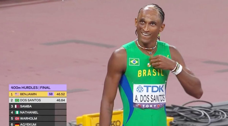 Alison dos Santos, o Piu, conquistou a medalha de prata nos 400m com barreiras, nesta sexta-feira, no Mundial de Tóquio, no Japão. Dono de dois bronzes olímpicos e campeão mundial da prova em 2022, o brasileiro, de 25 anos, completou a decisão em 46s84 e só ficou atrás do americano Rai Benjamin, que venceu com 46s52. O catari Abderrahman Samba completou o pódio, com 47s06.