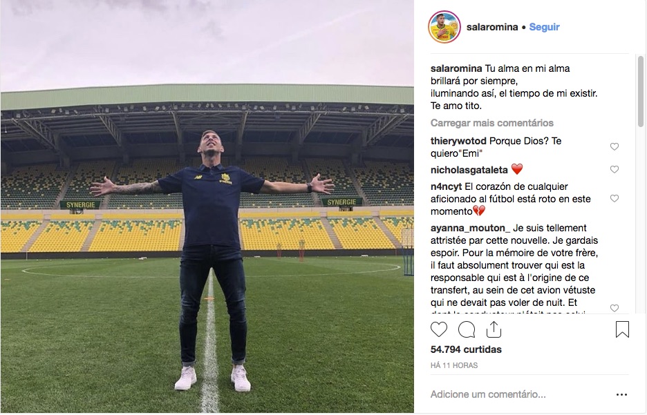 A irmã do atacante argentino Emiliano Sala expressou nas redes sociais horas depois da confirmação de que o corpo encontrado no avião no Canal da Mancha era mesmo do jogador. Na legenda da foto em que Emiliano aparece de braços abertos no campo, Romina Sala escreveu: "Sua alma em minha alma brilhará para sempre, iluminando assim, o tempo da minha existência. Eu te amo, tito."