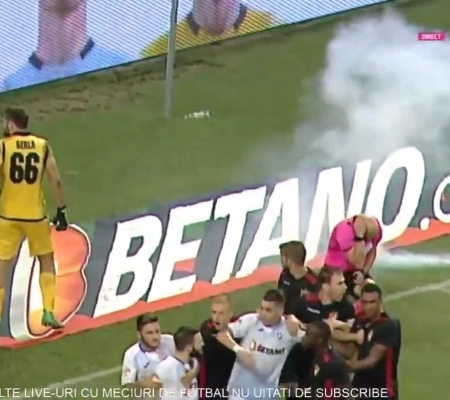 O árbitro norte-irlandês Arnold Hunter tentou conter a confusão, mas um sinalizador atirado da torcida romena estourou no gramado. O juiz foi atingido, e uma ambulância entrou às pressas no gramado. Segundo a agência de notícias romena “Agerpres”, Hunter foi atendido por alguns minutos, conversou com os auxiliares e permaneceu em campo.