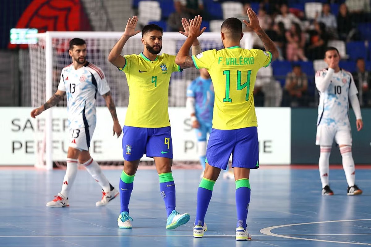 O Brasil dominou a Costa Rica, venceu por 5 a 0 e se classificou às quartas de final da Copa do Mundo de Futsal de 2024. Marcel, Felipe Valério, Leandro Lino e Neguinho, duas vezes, marcaram na goleada.