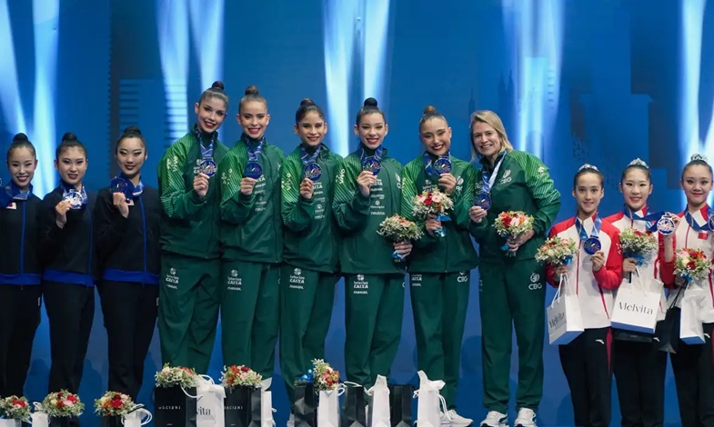 A ginástica rítmica brasileira conquistou pela primeira vez na história uma medalha de ouro no conjunto geral em uma etapa da Copa do Mundo da modalidade. A façanha ocorreu neste sábado (19), na etapa de Milão (Itália), quando as brasileiras subiram ao topo do pódio, com nota final 52.850, acima das obtidas pela equipe japonesa (50.500) e chinesa (50.200), que ficaram com prata e bronze, respectivamente.