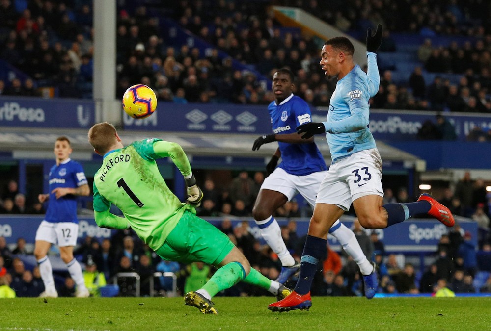 Gabriel Jesus passa pelo goleiro PIckford para marcar o segundo gol do City — Foto: Phil Noble/Reuters