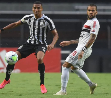 A primeira chance do jogo aconteceu apenas aos 18 minutos, em cobrança de falta de Daniel Alves, mas o camisa 10, como de costume, mandou por cima do gol, sem perigo para o goleiro João Paulo. O Santos, por sua vez, tratou de responder aos 23 minutos, de forma muito mais aguda. Lucas Braga enfiou para Arthur Gomes, que saiu em velocidade e bateu cruzado, da entrada da área, carimbando a trave de Tiago Volpi. No rebote, Juanfran ficou com a bola, titubeou, mas, no fim, tocou para o goleiro são-paulino, que saiu jogando.