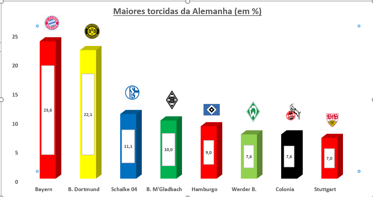 Bayern e Borussia Dortmund brigam pelo primeiro lugar. O Bayern aparece na frente com 23,6%, com o rival da Westfalia (Noroeste, a região mais rica do país) em segundo com 22,1%. Porém, o que há de mais relevante é a queda constante e vertiginosa do Schalke 04, que sempre apresentou empate técnico com os líderes Bayern e Dortmund e, de 2010 para cá, ano a ano vê a dupla manter a dianteira enquanto o "time do povo" perde o seu maior trunfo: o fator de ter grande número de torcedores por todo o país e não apenas na sua região. O Schalke aparece com 11,1% e viés sempre em queda. Em quarto, e muito próximo de assumir o terceiro posto está o Borussia M`Gladbach (10%), que superou o Hamburgo, tradicionalmente o quarto entre as quatro grandes torcidas e que está na Segundona (9%).