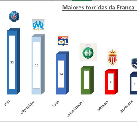 França - A disputa pelo primeiro lugar geral é ferrenha. Historicamente, o Olympique de Marselha, que é um time que fica no Sul do país mas com torcida em todo o território francês, é o líder e manteve a ponta na pesquisa que o Instituto Kantar realizou em 2015, com margem muito apertada para o Paris Saint-Germain: 13% a 12%. Porém, numa pesquisa pedida pela Liga Profissional do Futebol em 2019, os números foram incrivelmente mais relevantes, com o PSG sendo colocado com 22% contra 20% do Olympique. Entenda isso nos próximos gráficos.