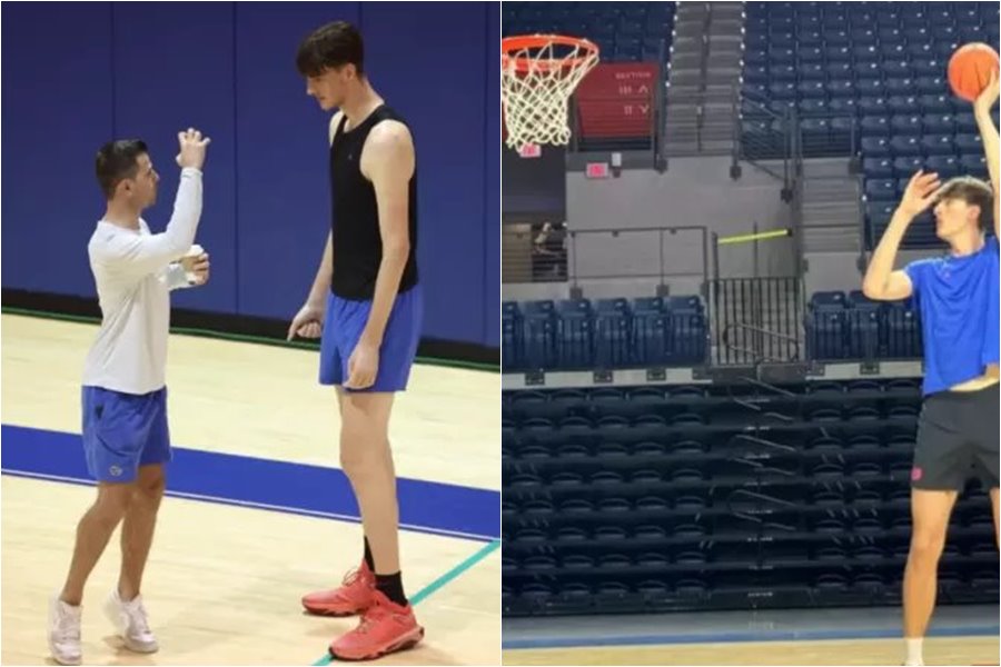 O novo reforço dos Gators, de 18 anos, mede 2,37m, embora tenha sido registrado com 2,40m (7,9 pés) — a NCAA permite medições com sapatos. Natural de Terrebonne, no Quebec, ele pesa 131 kg (290 libras). Olivier Rioux é reconhecido pelo Guinness como o adolescente vivo mais alto do mundo.