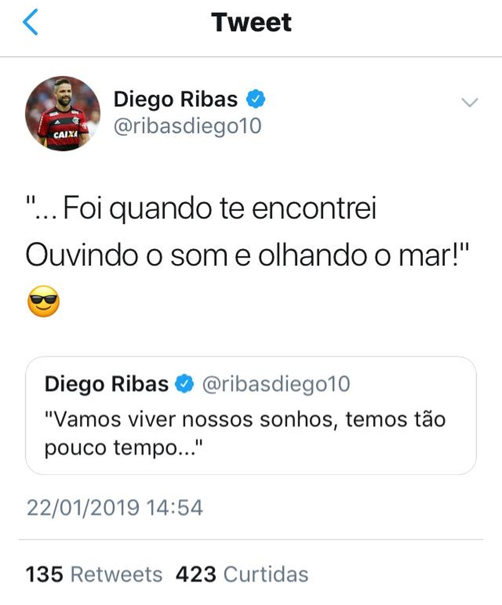 Diego se mostrou animado antes do treino desta terça-feira e usou sua conta no Twitter para "cantar" um trecho da música "Como Tudo Deve Ser", da banda Charlie Brown Jr. Até aí nada demais, só que a letra é continuação de um tuíte seu de julho de 2016, com a mesma canção, quando foi contratado pelo Flamengo. O motivo? Exatamente o que os torcedores suspeitaram: o camisa 10 rubro-negro acabou de assinar a renovação de contrato até o fim de 2020.
