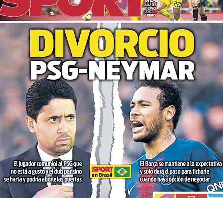 Neymar continua sendo o centro das atenções, tanto dentro quanto fora do futebol. Após as acusações de estupro por parte de Najila Trindade e também o corte da seleção brasileira na Copa América por lesão, agora o jogador pode estar de saída do PSG. Com o título "Divórcio total entre PSG e Neymar ", o jornal catalão "Sport" estampa em sua capa que o clube francês descarta o camisa 10 na próxima temporada e abriu de vez a porta para sua saída. Dois anos após ser contratado por 222 milhões de euros junto ao Barcelona , o que o tornou o jogador mais caro da história do futebol, o time parisiense está insatisfeito com o que o astro tem apresentado desde 2017.