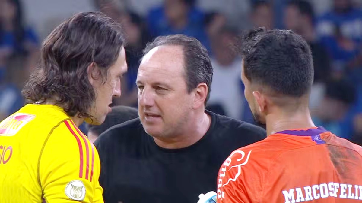 A cena da conversa entre Rogério Ceni, técnico do Bahia, e Cássio, goleiro do Cruzeiro, chamou a atenção após o empate de 1 a 1 entre as equipes no Mineirão. Durante a conversa, o treinador aconselhou o jogador cruzeirense a não se sobrecarregar devido ao edema na perna direita, conforme destacou o dublador Gustavo Machado.